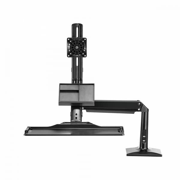You can attach this versatile workstation mount to the edge of a desk with a clamp, plus it comes with a VESA compliant bracket that fits displays measuring 22” to 35”. Adjust the height to your pleasure and enjoy a moving keyboard that lifts for proper height whether you’re sitting or standing. With the FC35, the arm is extendable and foldable and can be moved out of the way if you need more desk space. It features a built-in gas-strut cylinder with aluminum alloy and steel construction, with cable management under the arms. There are also two USB interface adaptors so you can charge an iPad or smartphone without taking up extra room. Best of all, the modular design lets you use the install the sit-stand workstation with easy in smaller spaces for both the office and the home.